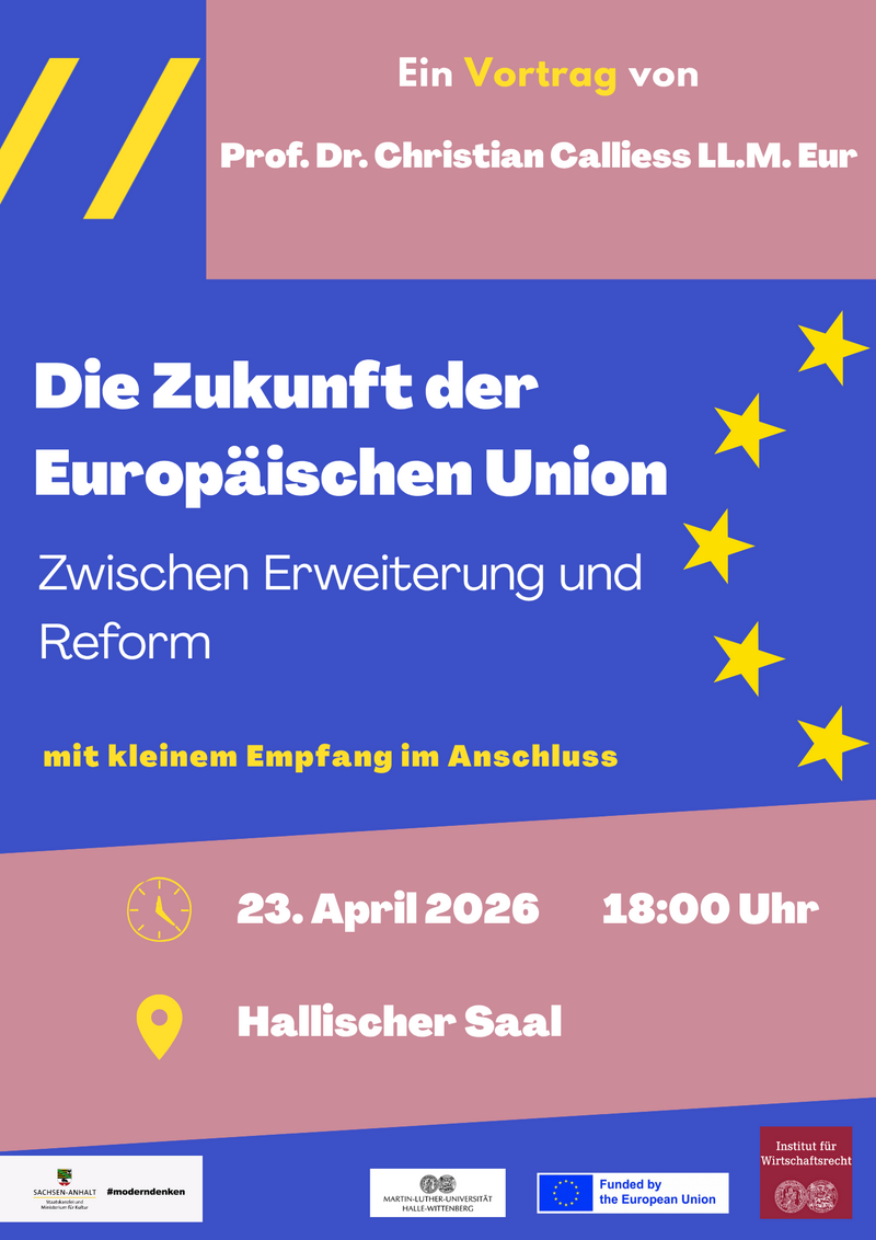 Am 23. April 2026 um 18 Uhr lädt das Europäische Dokumnettaionszentrum Sachsen-Anhalt an der Martin-Luther-Universität Halle-Wittenberg in Kooperation mit der Staatskanzlei und Ministerium für Kultur des Landes Sachsen-Anhalt zu einer Vortragsveranstaltung mit dem Titel „Die Zukunft der Europäischen Union – Zwischen Erweiterung und Reform“ ein. Die Veranstaltung findet im Hallischen Saal der Universität statt.